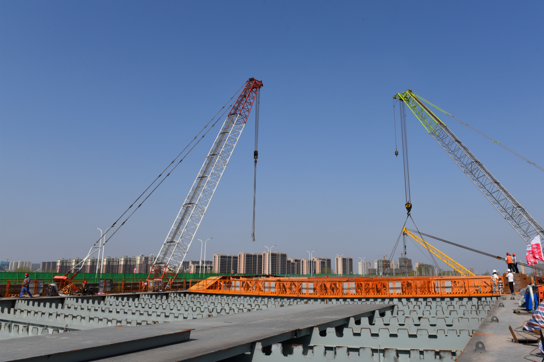 机器轰鸣、钢架林立、塔吊耸立,5月1日,在北京路快速化改造工程跨京杭运河特大桥施工现场,建设工人戴着口罩不停穿梭于道路开挖、管道铺设、桥梁架构等各个作业面,北京路快速化改造工程项目管理组组长朱宝广与技术员认真核对图纸,反复商讨下一阶段施工方案。