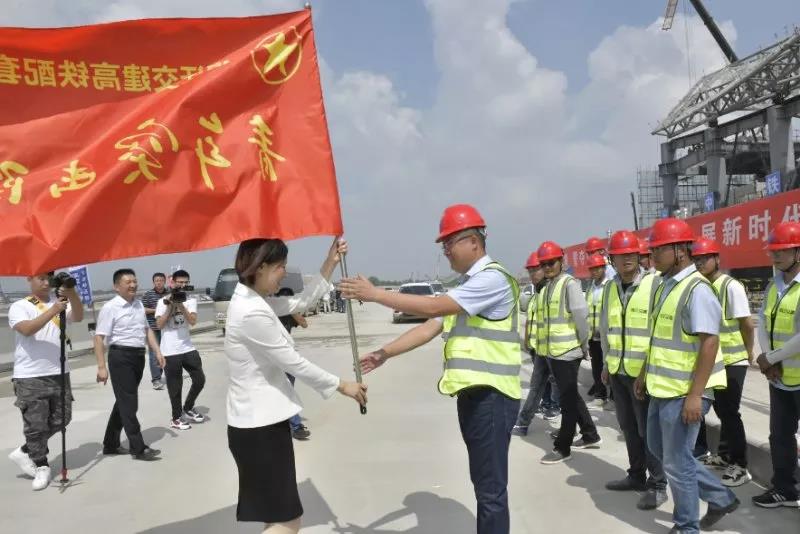 高铁配套工程青年突击队授旗,勉励工程一线青年突击队发扬不怕苦不怕累的奋斗精神,重视安全生产,争创一流,助力宿迁早日实现高铁梦。