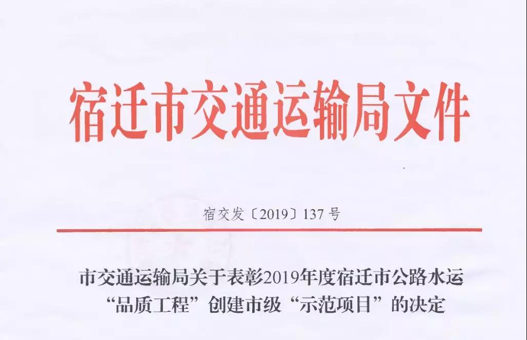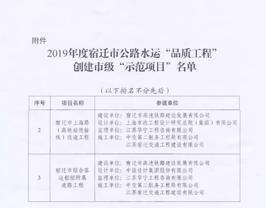 10月16日,宿迁市交通运输局下发关于表彰2019年度宿迁市公路水运 “ 品质工程” 创建市级“ 示范项目”的决定,宿迁市高速铁路建设发展有限公司(简称高铁公司)承建的市上海路(高铁站连接线)改造工程和综合客运枢纽附属道路工程“入选”。