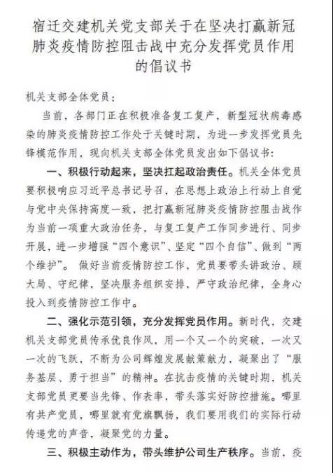 会上,机关支部发出《关于在坚决打赢新冠肺炎疫情防控阻击战中充分发挥党员作用的倡议书》,号召支部全体党员要积极行动起来,坚决扛起政治责任;要强化示范引领,充分发挥党员作用;要积极主动作为,带头维护公司生产秩序。