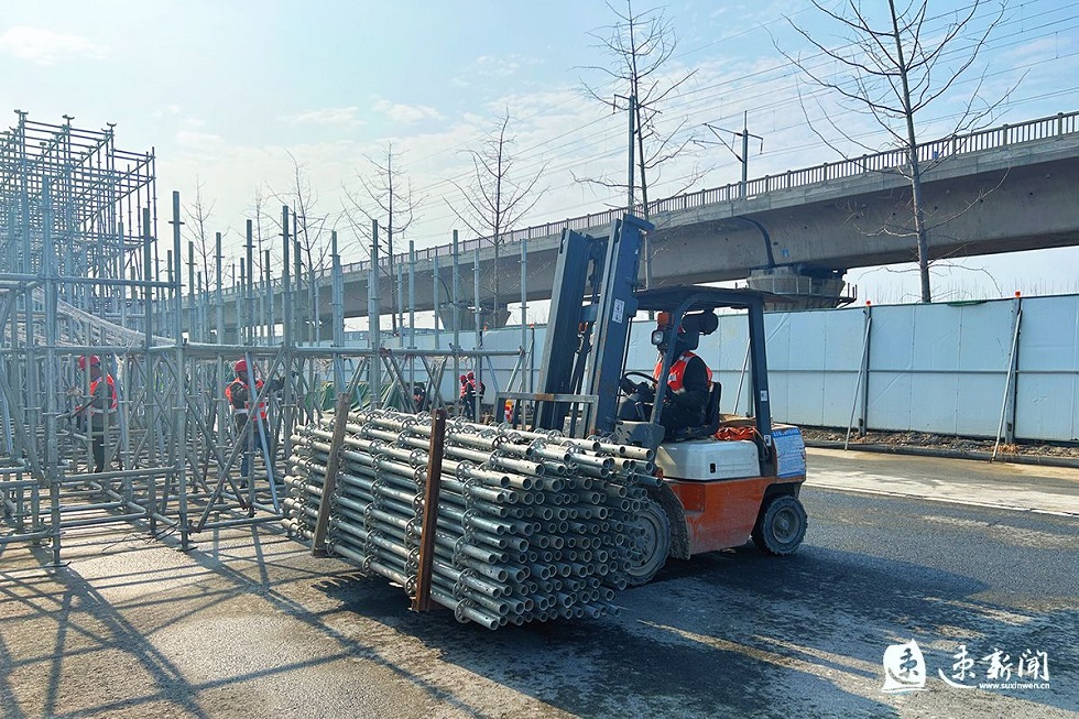 “我们工人大部分是外地的,目前已陆续返岗复工。”宿迁市港城路上跨铁路专用线桥梁工程施工单位现场负责人介绍,今天上午六点多就开工了,大家齐心协力、分工协作,正在同步开展现浇箱梁预应力张拉和支架搭设。