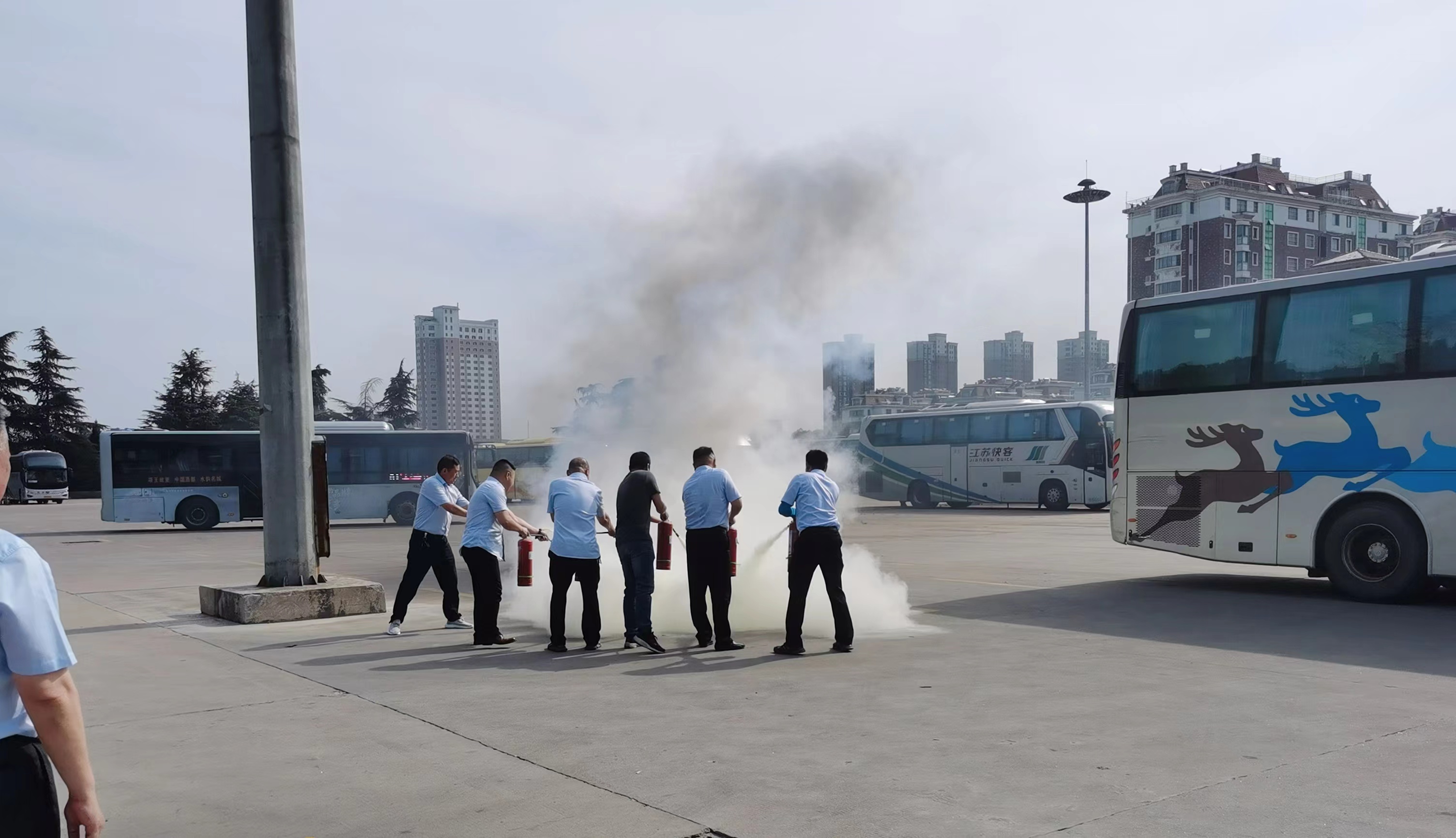 培训会上,教官详细讲解火灾的危险性及身边不安全行为可能导致的火灾隐患,从“防火”“灭火”“逃生”“自救”四个方面,进行集中培训。随后,全体职工参与演练,现场模拟“客运车辆起火”的场景,班车驾驶员迅速反应,并按照预案要求,有序进行降速停车、疏散乘客等应急处置工作;工作人员有序引导乘客下车,并第一时间开展初起扑救行动,从而有效控制火灾险情。