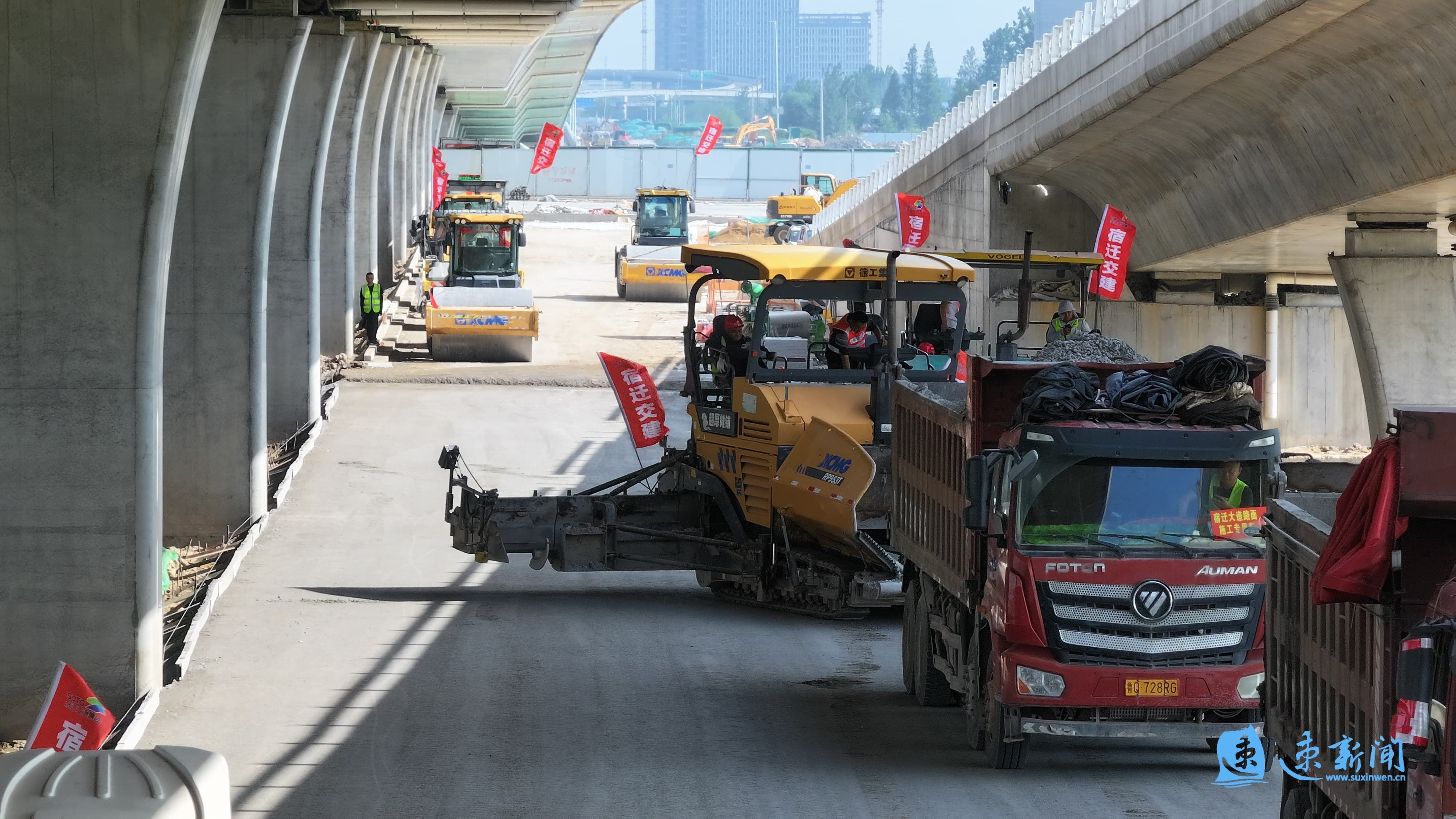 高空俯瞰建设中的酒都路快速化改造工程,这条南北走向的交通动脉已全线贯通,宛如一条绵延的钢铁巨龙,气势恢宏。桥下施工区域,两台摊铺机正匀速摊铺水稳层,压路机紧随其后来回碾压,现场机械轰鸣,一派繁忙有序的施工景象。截止目前,完成投资21.09亿元,占项目总投资的92%,预计年底建成通车。