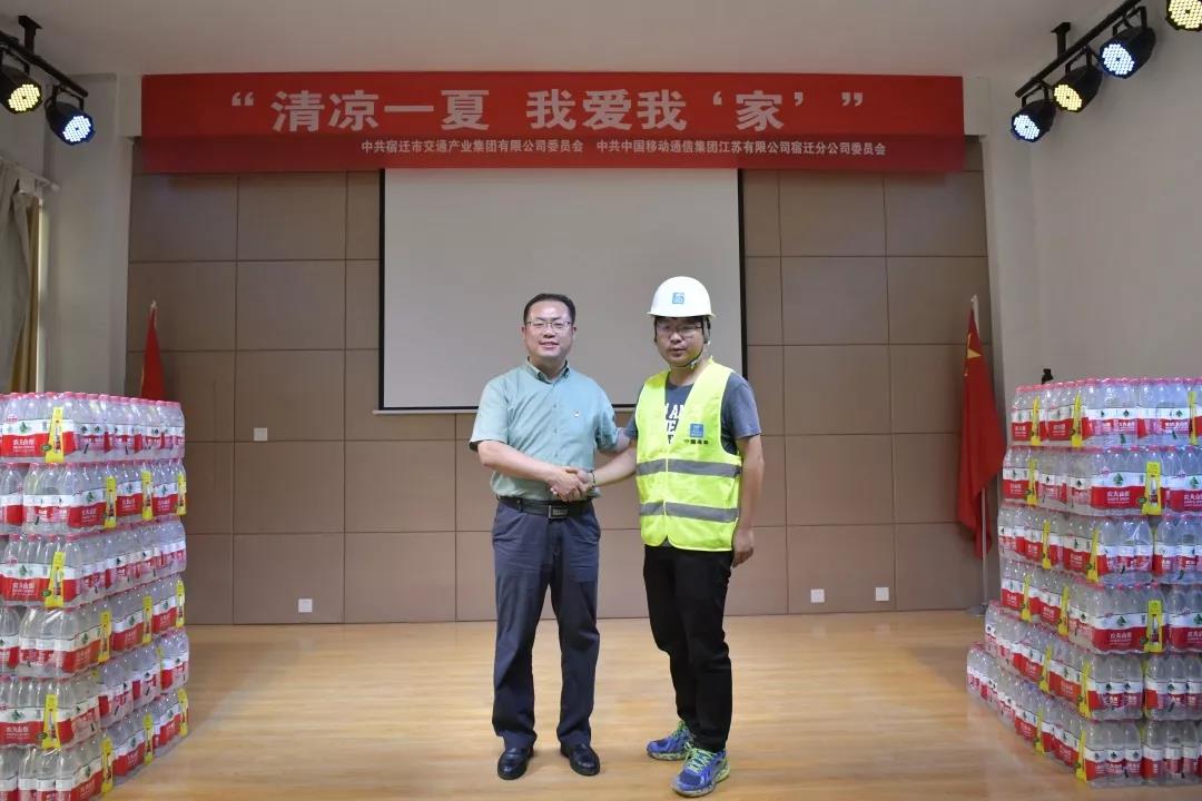 夏日炎炎送清凉,浓浓关怀暖人心。8月2日上午,亚洲情色 携手中国移动通信集团江苏有限公司宿迁分公司(以下简称中国移动宿迁分公司)来到高铁工程综合客运枢纽工程一线“党建·家”,开展“清凉一夏,我爱我‘家’”活动。为奋战在高铁项目一线的建设者们送来了100箱矿泉水等清凉用品。