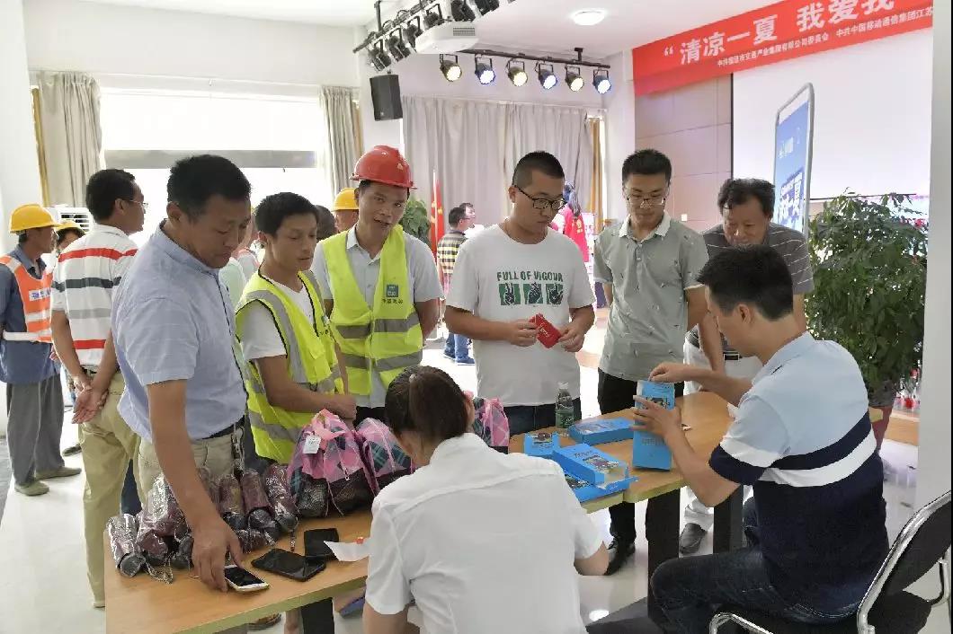 活动期间,中国移动宿迁分公司领导一行还给建设者们送来了雨伞、牙刷、毛巾、洗发水、香皂等生活用品,并给一线建设者免费更换手机贴膜和清洗手机服务。