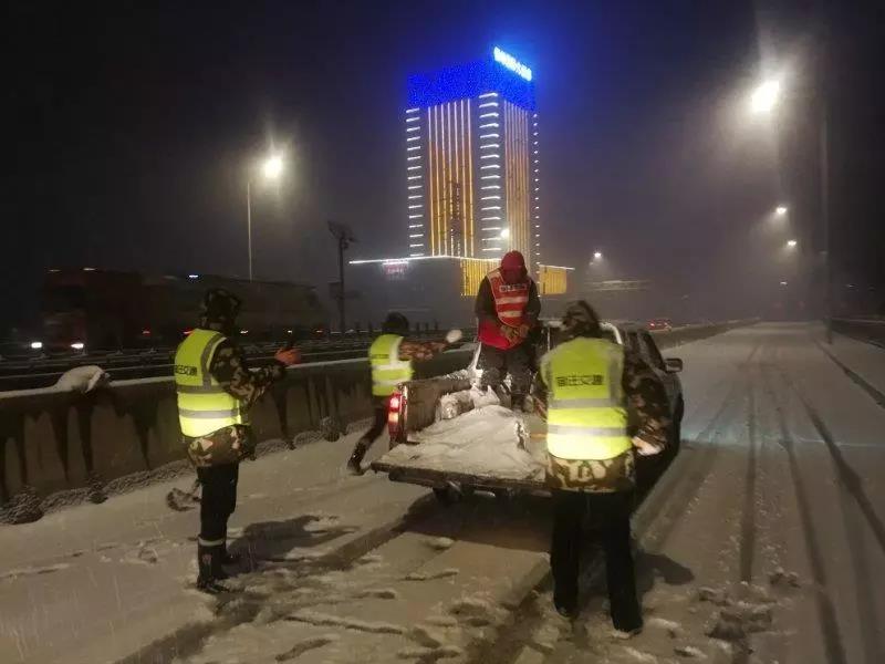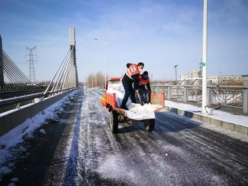 养护人员首先对道路、桥梁坡道、匝道、弯道等处撒上融雪剂、工业用盐,再利用多台除雪设备采用人机混合梯队作业的形式进行除雪铲冰工作,确保三号桥、七号桥、发展大道桥等重点桥段全线车道无积雪、无结冰。截至16日凌晨2点左右,共出动养护人员70多名、装载机4台,投入运输车辆10台,调集使用融雪剂40吨、工业盐50吨。