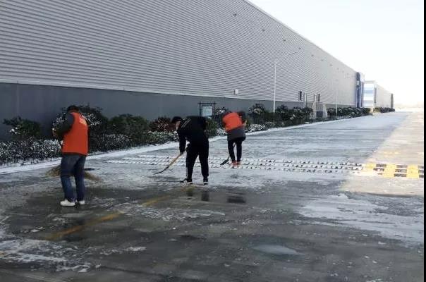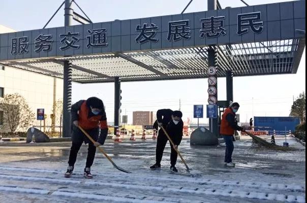公司积极组织党员干部职工及园区物业做好园区清雪工作,对园区各封闭出入口进行防风固定,在各主干道路、仓储区域和办公区等处,撒好除雪剂并进行融雪、除雪工作,确保复工车辆及人员出行安全。此外,疫情防控先锋岗在做好进出园区人员测温、登记等工作的同时,叮嘱过往人员车辆减速、慢行、注意防滑。
