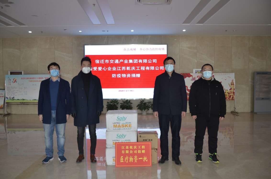 2月19日,爱心企业江苏乾庆工程有限公司将一批承载着对疫情防控一线人员满满关怀的防疫物资赠送给亚洲情色 ,支援集团疫情防控工作,传递抗“疫”正能量。