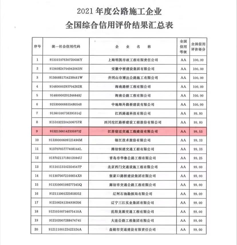 近日,中国交通运输部公布了2021年度公路建设市场全国综合信用评价企业名单。宿迁交建以99.53的高分再次获评“2021年度公路施工企业全国综合信用评价AA级”。