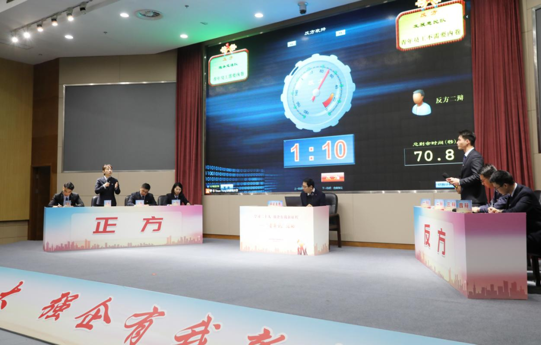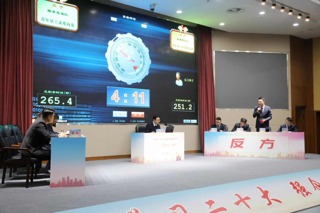 活动中,在辩论主席介绍完比赛流程,双方队员自我介绍之后,比赛正式开始。正方“服务交通队”和反方“发展惠民队”以“青年员工需不需要内卷”为主题开展了一场别具一格、亮点纷呈的辩论赛。双方选手注意力集中,在开篇立论、一对一攻辩、自由辩论和最终结辩环节中,集团8位青年辩手思路清晰、观点明确,旁征博引、侃侃而谈,将比赛一次又一次推向高潮,现场观众也被带入到紧张的氛围之中。最后,经过专家点评和集团领导班子成员投票,正方一辩和反方三辩分别获得“最佳辩手”称号。