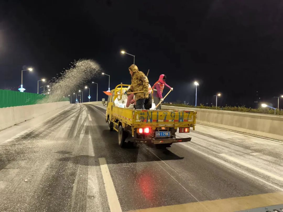 高铁公司立即启动应急预案,组织养护单位迅速至北京路、迎宾大道二期、洋河大道、上海路等路段开展融雪除冰工作;同时,联合市公安局铁骑大队互动巡查,确保道路安全畅通。宿迁交建道路养护党员突击队第一时间上路,通过撒布融雪剂、融雪盐和摆放防滑料,及时破除清扫结冰、积雪路段。