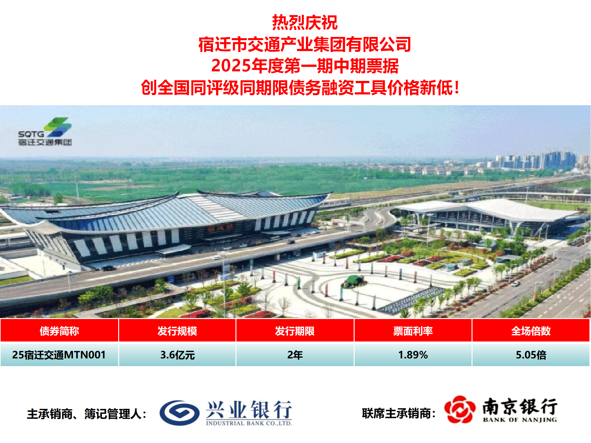成功发行2025年第一期中期票据,本期债券发行规模3.6亿元、期限2年、票面利率1.89%,全场认购5.05倍。本次债券利率首次突破2%以下,创全国同评级同期限发行价格最低。