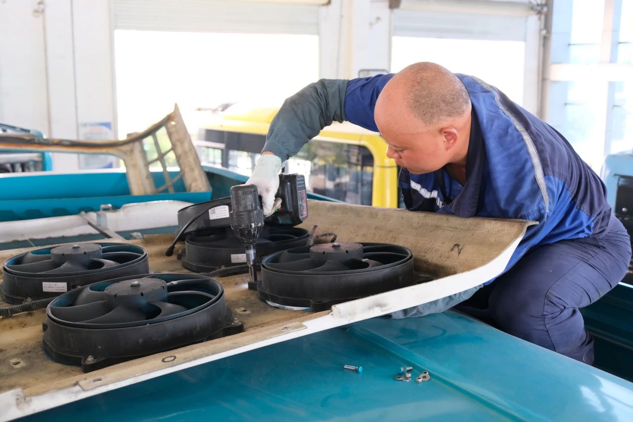 在维修车间的另一处,凡帅和沈井师傅正在对公交车的空调系统进行检修。由于长时间在高温环境下工作,公交车的空调很容易出现故障。凡师傅拆开空调外壳,里面的热气瞬间涌了出来,他的额头上瞬间布满了汗珠,仔细地检查着每一个零件,生怕错过任何一个细小的问题。