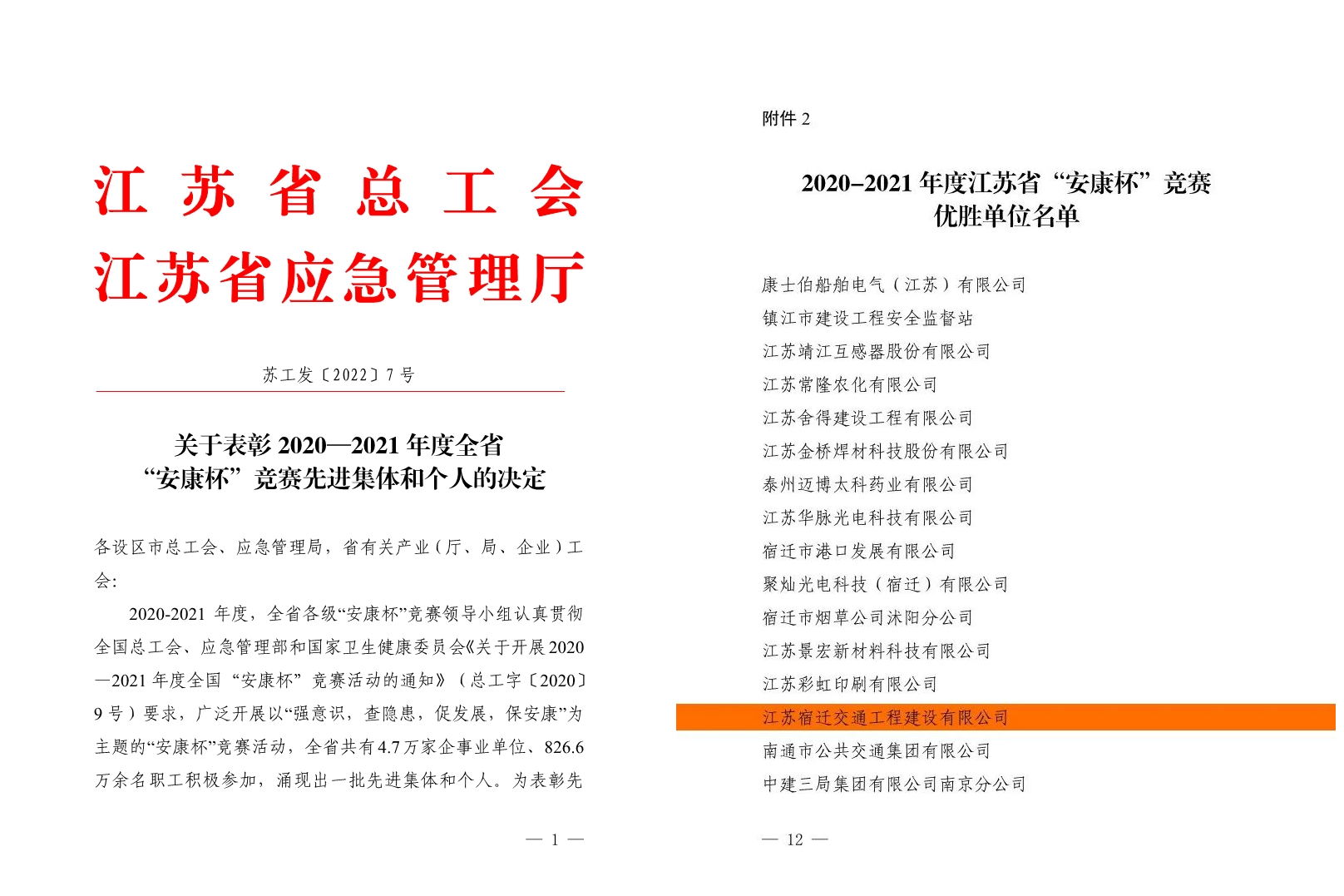 日前,省总工会和省应急管理厅发文通报了2020-2021年度江苏省“安康杯”竞赛评选情况,宿迁交建荣获省“安康杯”竞赛“优胜单位”称号。