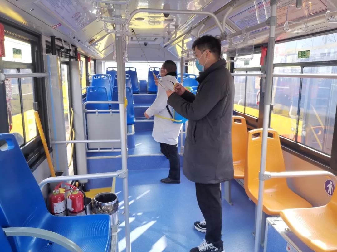 离下午到岗时间还有大半个小时,汪俊便早早来到调度站内。经过两次体温检测后,他来到即将开出的公交车上,仔细检查车辆通风设备,并在扶手、地面、座椅、吊环等部位喷洒消毒液。