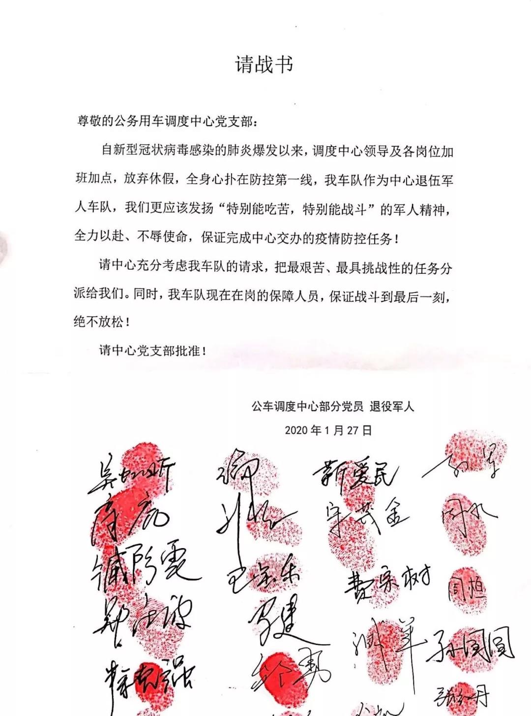 “请把最艰苦、最具挑战性的任务分派给我们,我们必定全力以赴、不辱使命,保证完成组织交办的各项疫情防控任务”。1月27日,公车调度中心23名党员同志向党支部递交了一份印满红手印的“请战书”,短短百余字,字字铿锵,句句深情。他们中有工作经验丰富的“60后”、有刚走上工作岗位的“95后”、有两岁孩童的妈妈、有备受父母宠爱的女儿......但此刻,面对这场无声的“战役”,他们不忘自己更是一名党员、是退役军人、是勇往直前的“战士”,他们迫切希望加入党支部的疫情防控党员先锋队,为打赢这场疫情防控阻击战贡献自己的力量。