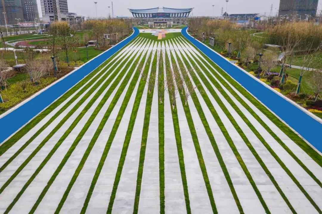 蓝天白云之下,市高铁商务区酒都广场的彩色沥青道路与绿化景观相得益彰、浑然一体。