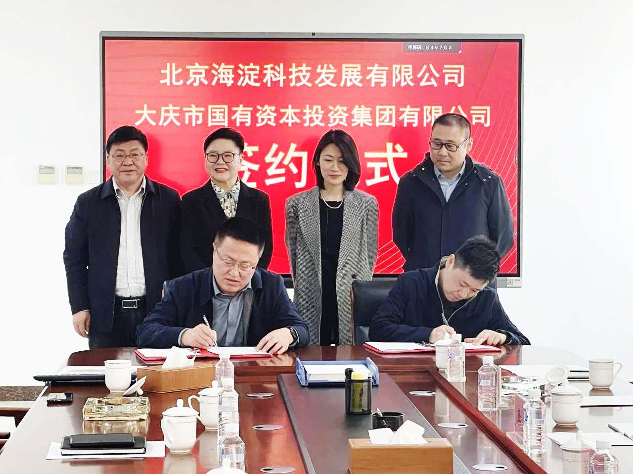 4月26日上午,海科技公司与大庆国投在大庆市举行了战略合作协议签约仪式。海国投集团党委委员、副总经理肖琳娜;大庆国投党委书记、董事长王珏,副党委书记、总经理李远杰,党委委员、副总经理王世江;海科技公司董事长祝贺,海科技公司董事长助理李楠,海国龙油董事长王庆明,海国龙油副总经理柴铭,大庆三聚总经理王东亮,海科技公司供能业务板块总经理王广韬等共同出席签约仪式。