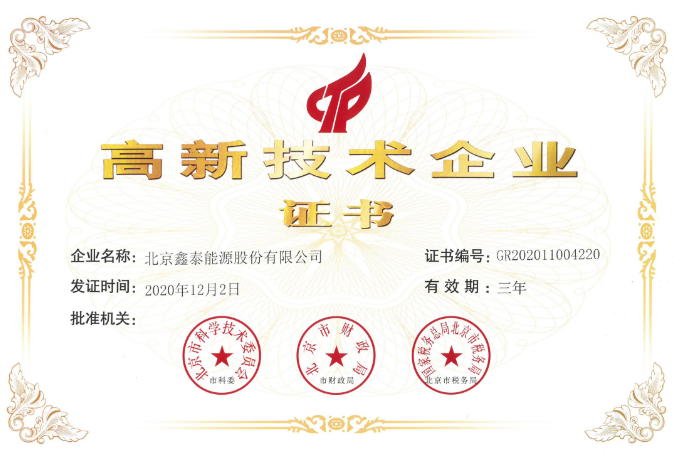 根据全国高新技术企业认定管理工作领导小组办公室下发的相关文件,鑫泰能源通过“国家高新技术企业”认定,并由北京市科学技术委员会、北京市财政局、国家税务总局北京市税务局联合颁发《高新技术企业证书》。这是鑫泰能源坚持“以科技为先导、以创新为动力”所取得的一项重大发展成果。该项证书的取得,不仅是公司一年多来坚持技术创新的有力诠释,同时也代表着公司具备了自主创新的科技研发实力。