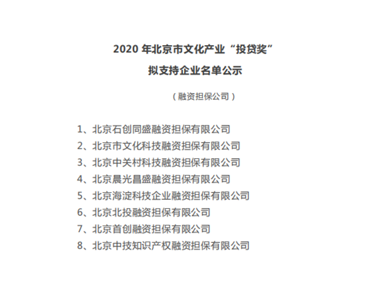 根据《北京市实施文化创意产业“投贷奖”联动推动文化金融融合发展管理办法(试行)》(京文领办文〔2017〕3号)、《文化创意产业“投贷奖”联动政策金融机构考核奖励实施细则》(京财科文〔2019〕2343号)及《关于集中审核北京市文化产业“投贷奖”支持资金申报项目的通知》,12月10日,北京市国有文化资产管理中心对2020年“投贷奖”资金拟支持名单进行了公示。此次进入名单公示的文化企业、金融机构共899家,其中8家融资担保机构,北京中技知识产权融资担保有限公司名列其中。