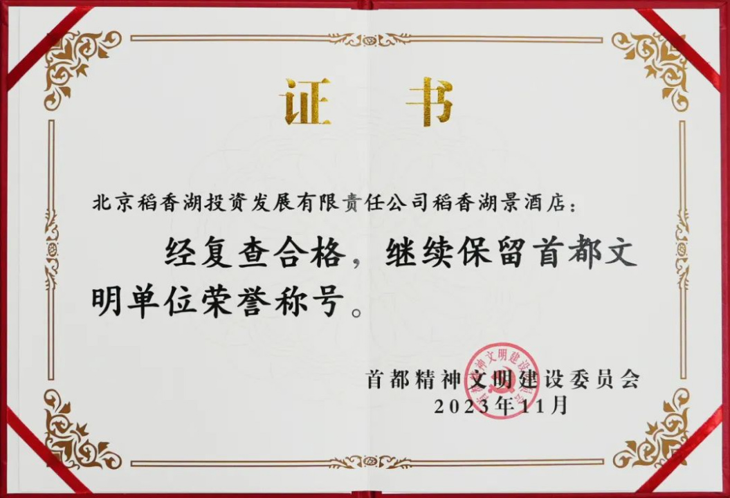 近期,海国投集团两家所属企业收到首都精神文明建设委员会颁发的奖牌与证书,北京龙徽国际酒文化创意产业有限公司荣获 2021-2023 年度“首都文明单位”称号,北京稻香湖投资发展有限责任公司稻香湖景酒店经复查合格,蝉联“首都文明单位”荣誉称号!