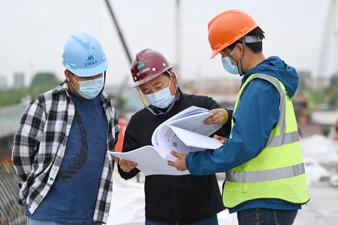 机器轰鸣、钢架林立、塔吊耸立,5月1日,在北京路快速化改造工程跨京杭运河特大桥施工现场,建设工人戴着口罩不停穿梭于道路开挖、管道铺设、桥梁架构等各个作业面,北京路快速化改造工程项目管理组组长朱宝广与技术员认真核对图纸,反复商讨下一阶段施工方案。