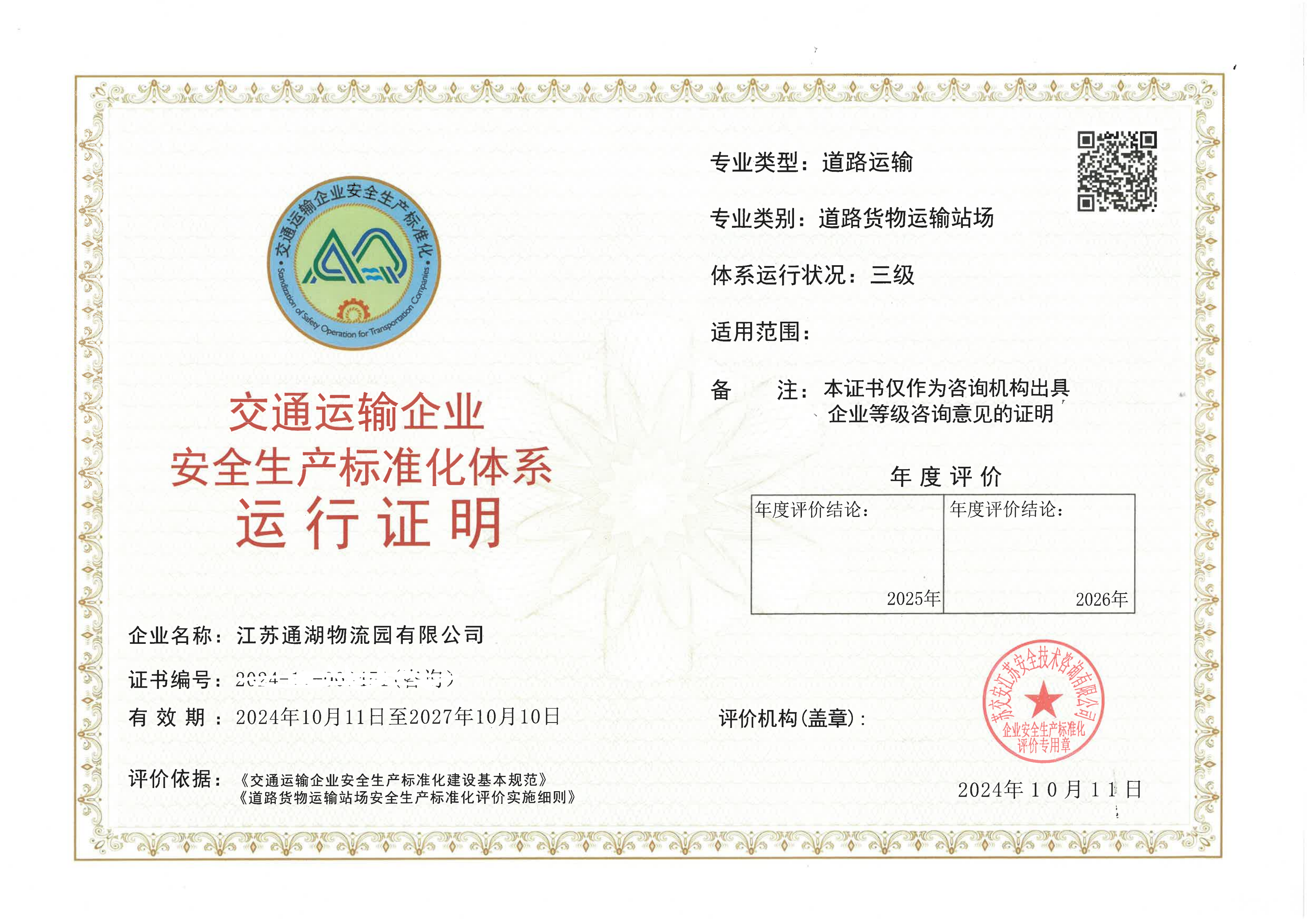 近日,通湖物流园荣获交通运输企业安全生产三级标准化证书,为全市首张道路货物运输站场安全生产标准化等级证书,标志着公司安全生产标准化管理迈上新台阶。