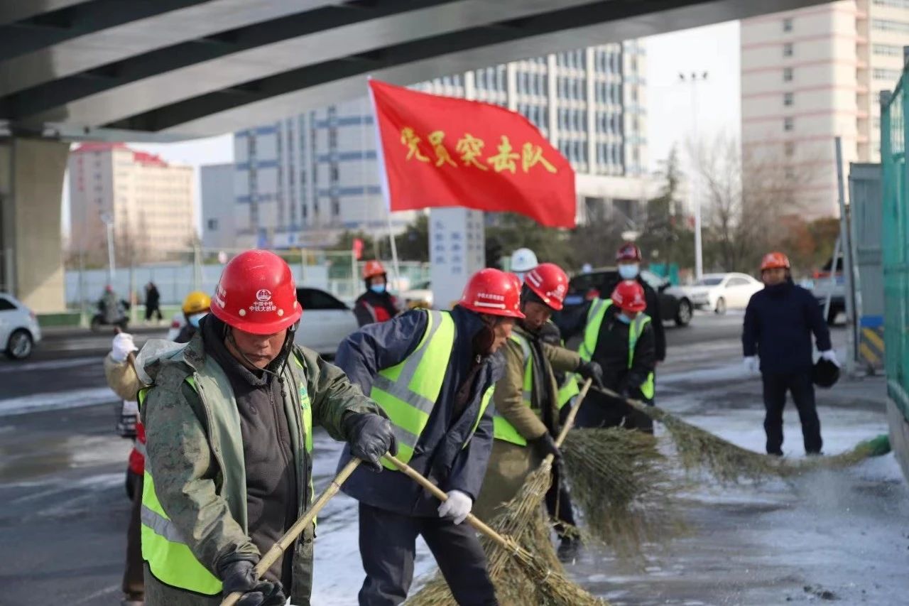 在迎宾大道二期快速化改造工程施工现场,高铁公司调动95名施工管理人员与一线建设者,对迎宾大道与西湖路交汇处等14个路口撒布融雪剂,对结冰、积雪路段进行破冰清除。共出动高压水车7台、小货运输车3辆、皮卡车4台、巡视车辆8台,融雪剂1吨、融雪盐3吨,目前各路口和易冻易滑路段均通行畅通。