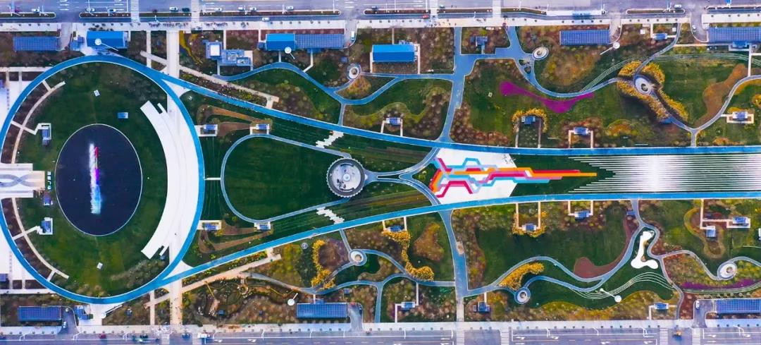 蓝天白云之下,市高铁商务区酒都广场的彩色沥青道路与绿化景观相得益彰、浑然一体。